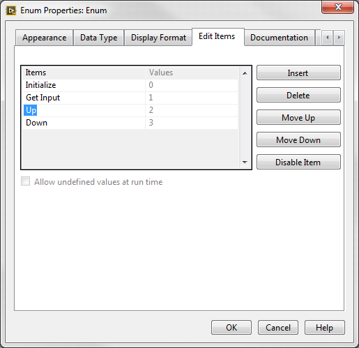 Once the Type Def is open, we can set the items of the enum. For this example the Up, Down, Initialize, and Get Input have been entered.
